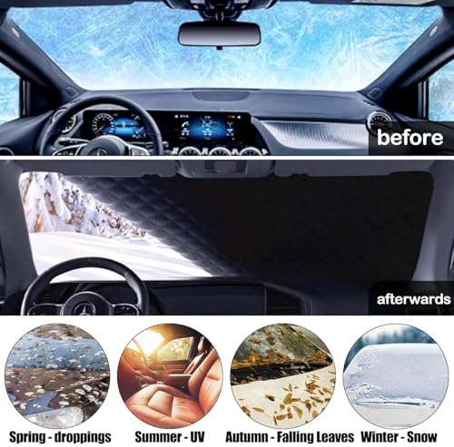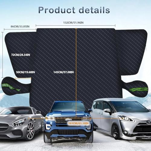 【More Protection for Your Car】The dimensions of the winter windshield cover are 218 x 161 x 145 cm (86 x 63 x 57 inches). The car windshield cover covers a larger area than other products and can better protect the windshield, side windows, door handles, wipers, and mirrors. Fully compatible with most cars and SUVs.