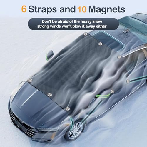 【No Fear of Wind and Snow】With 10 magnets (magnets wrapped in seam edges) that can be attached to the car windshield, they have strong adsorption capacity and therefore good adhesion. The windshield cover has 6 thick rubber cords with plastic hooks at both ends, so the windshield cover won't blow away. Its one-piece design secures it in all directions against wind.