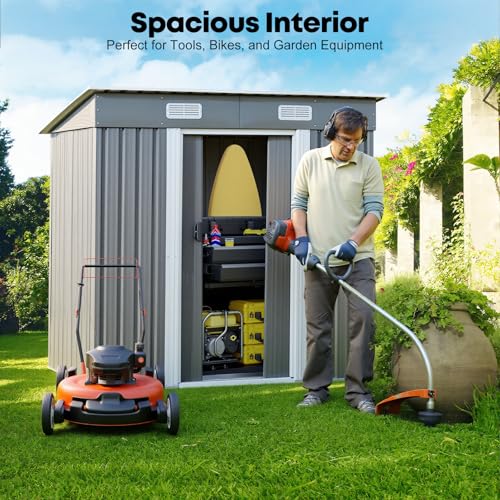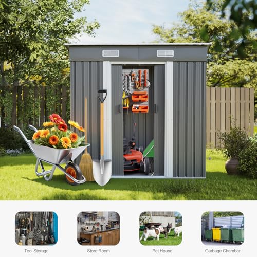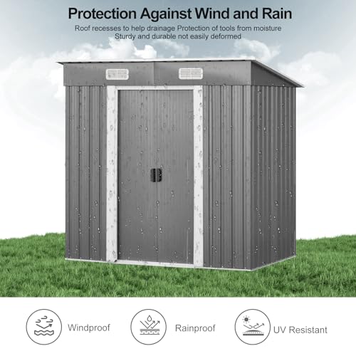 Metal Garden Shed with Floor Foundation, 72x44cm Outdoor Storage Tool House, Sloped Roof Design, Ventilation Slots, Lockable Sliding Double Doors, Galvanised Steel Base (Grey)