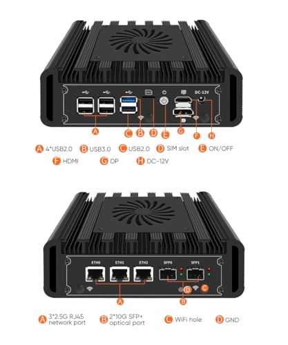 - 2 x InteI 82599ES 10G SPF+ ports, 3 x InteI i226-V 2.5GbE LANs, 1 x USB3.2 Gen1, 5 x USB2.0, 1 x HDMI2.0, 1 x DP1.4, 1 x SIM slot