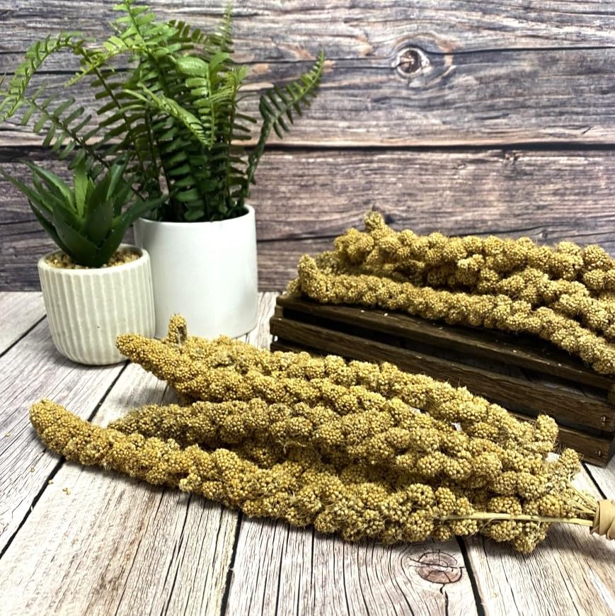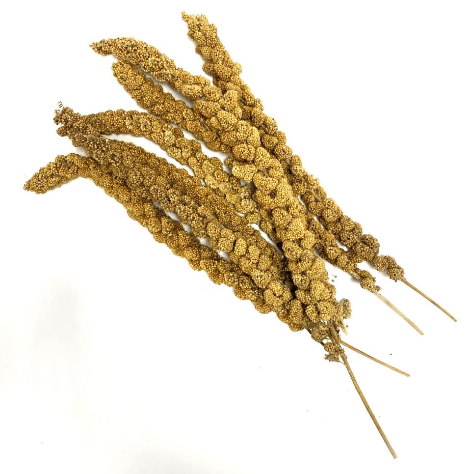 Millet is a type of grain which originated from Asia and Africa. Often the stalks are stripped of their seeds, which are used as a foodstuff in their own right or form part of many bird seed mixes. However, millet sprays are left in their entirely natural form, with the seeds still clustered on the stalks. They generally vary in length between 8-12" (20-30cm) and are usually a light tan or pale yellow colour.
