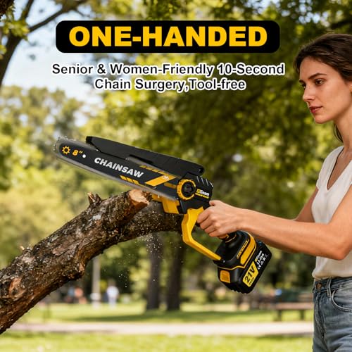 【Easy Operation with Versatile Sizes】: This cordless chainsaw (mini chainsaw) comes with 8-inch and 6-inch chainsaws, suitable for different cutting needs. It has an automatic oiler with a transparent oil pot (oil level visible in real time) and tool-free chain tensioning—just rotate to adjust, saving time and effort for tree trimmers and DIYers.