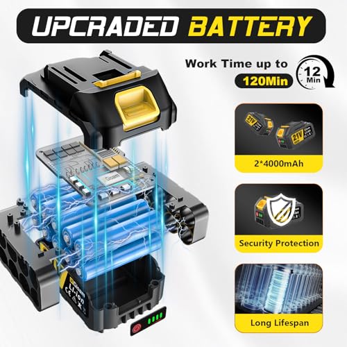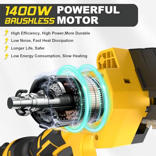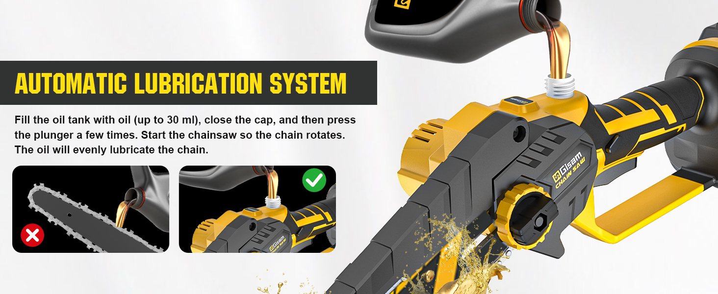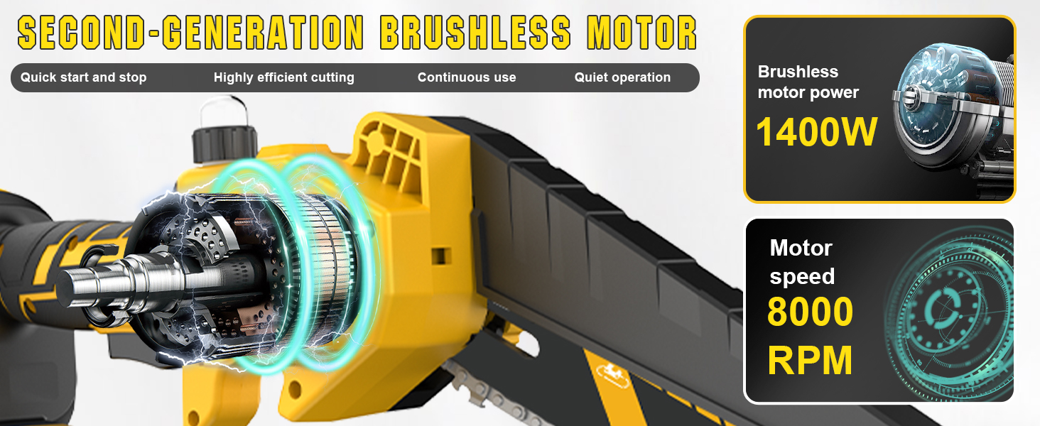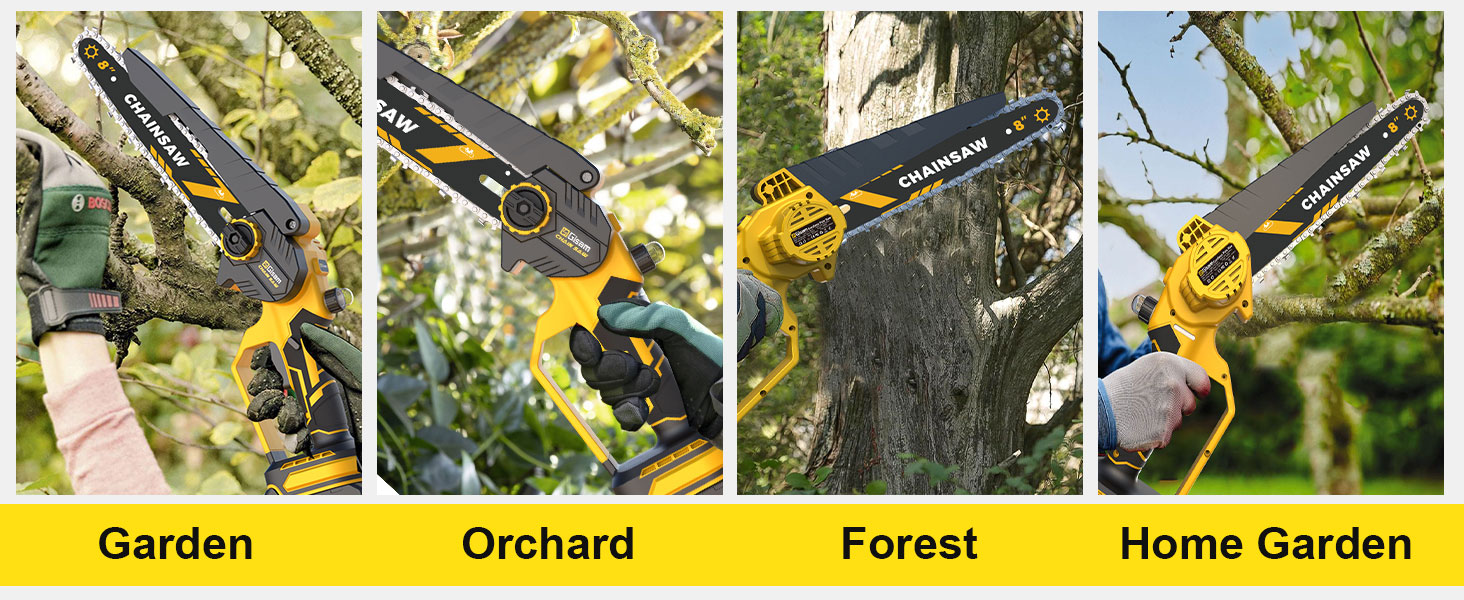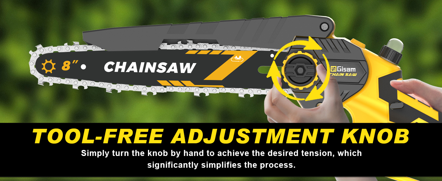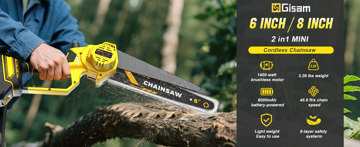 【1400W Brushless Motor for Efficient Cutting】: Our Gisam mini chainsaw (cordless chainsaw) features a 1200W high-performance brushless motor, which effectively reduces noise, prevents burnout, and extends service life. It boosts cutting efficiency significantly, making it easy to handle branch trimming and wood cutting tasks, ideal for homeowners, DIY enthusiasts and gardeners.