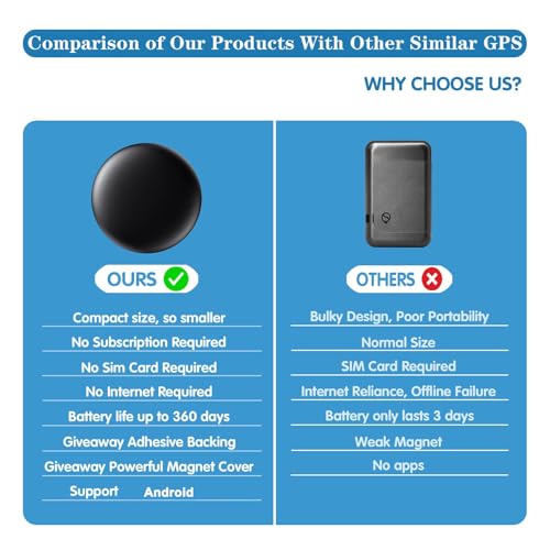 - 【No Monthly Fee, No SIM, No Subscription Required】This mini GPS tracker for vehicles requires no SIM card, no subscription, and no monthly fee. It works exclusively with goo- gle Find My Device (Android only), making it a reliable gps tracker for vehicles with real-time updates and zero ongoing cost.