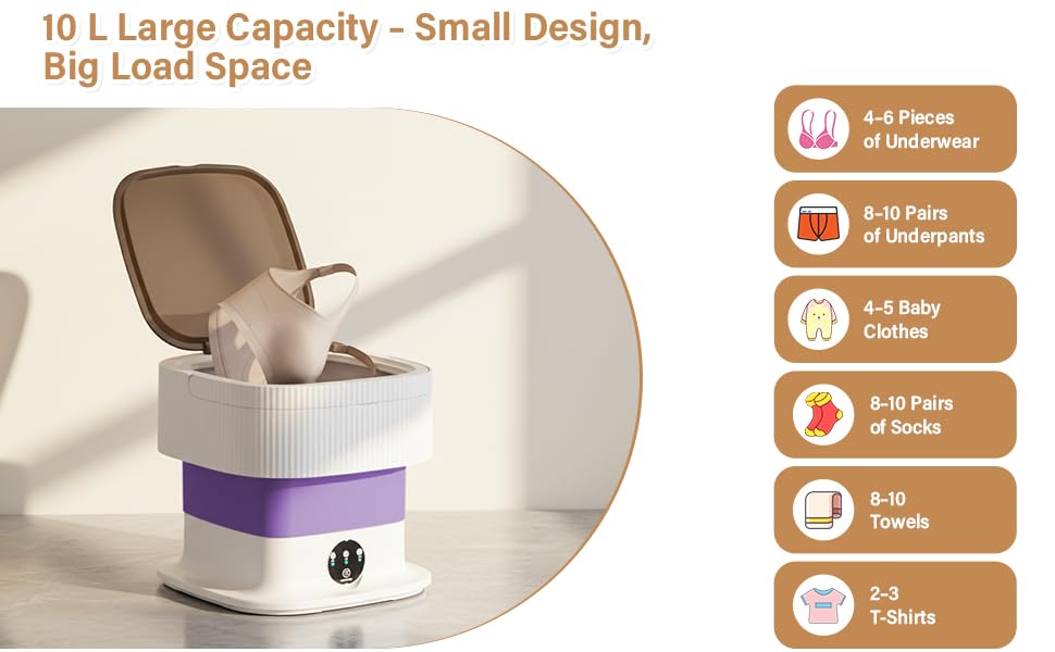 【Compact but Powerful Cleaning】Despite its small size, the mini washing machine simulates hand washing through a 360° rotating turbine, delivering gentle yet deep cleaning for underwear, socks, and baby garments