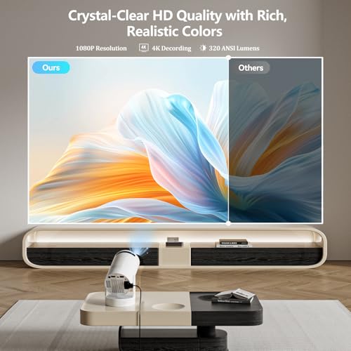️ Brilliant Full HD Visuals Experience stunning 1080P FHD clarity with support for 4K content. Featuring 320 ANSI lumens of brightness, this mini projector delivers vivid colors, sharp contrast, and lifelike detail—perfect for movie nights, gaming, and streaming your favorite shows.