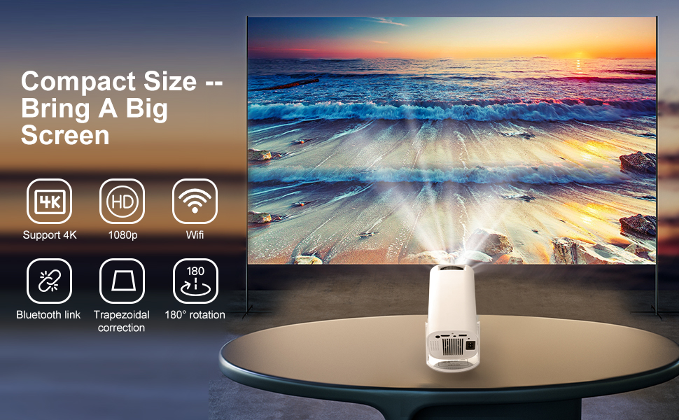 High Definition Projection Effect:Native 720P, Support 4K Video, Projector supports native 4K and 1080P decoding and brings you superior image fidelity and accurate color accuracy. This can give you a good image.Support for four-sided automatic correction (support for positive pitch correction, focal length adjustment needs to be manual)