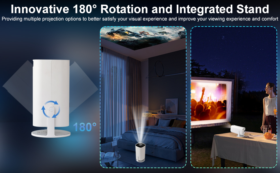 Vertical 180° Adjustment at Will:Portable projector with 180° rotatable stand can be easily projected from wall to ceiling, 40~150 inches wide to enjoy movies, play games and watch exciting sports events. Tired of sitting and watching, lying down and keep watching~