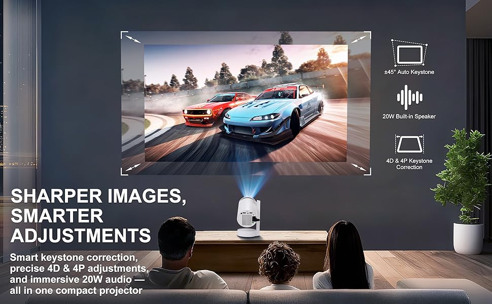 With auto keystone correction (±45°) and precise 4D & 4P adjustment, the picture stays perfectly aligned even when projected from an angle, giving you a clean and balanced view every time.