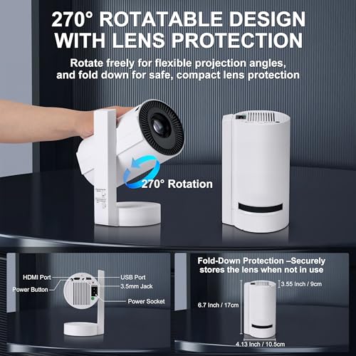 - With auto keystone correction and a 270° rotating arm, this mini projector easily transforms any wall or ceiling into your personal cinema, whether you are relaxing in the living room or enjoying movie time in bed.