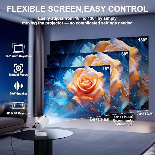 - Projection Size: 18"–130" (adjust by moving the projector) Approx. 1.6-9.8 ft (best view around 5.9 ft)