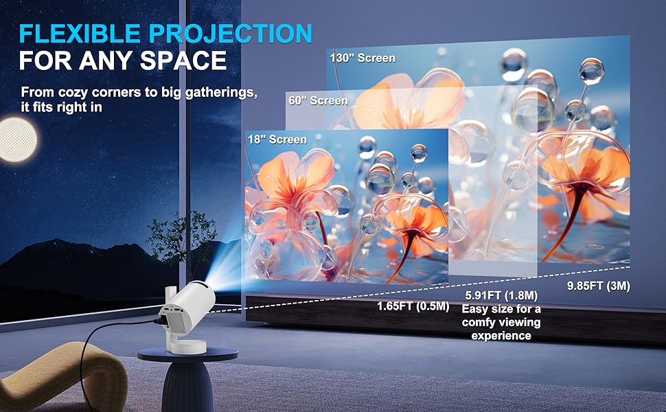 - Projection Size: 18″–130″ (adjust by moving the projector) Approx. 1.6-9.8 ft (best view around 5.9 ft)