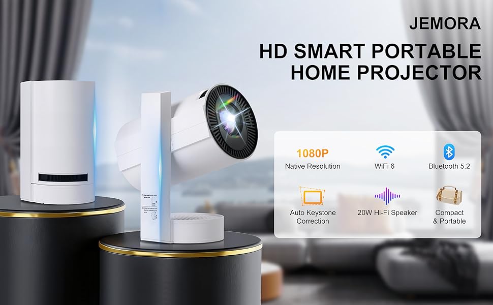 - The JEMORA mini projector combines elegant design, smart Android 11.0 technology, and a powerful 20W Hi-Fi speaker in one compact body. Enjoy your favourite movies, TV shows and games in vivid 1080P HD resolution, supported by WiFi 6 and Bluetooth 5.2 for smooth, reliable streaming.