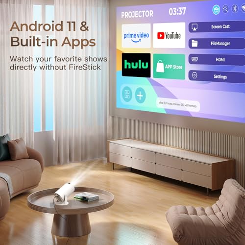 [Built-in Android 11 & WiFi 6 & Bluetooth 5.4] Stream smarter with this Android projector for buttery-smooth streaming on YouTube, Prime Video and other apps. WiFi 6 and Bluetooth 5.4 bring lightning-fast startup and ultra-low latency for a smoother video and gaming experience. Versatile HDMI/USB/Audio ports instantly connect to laptops, gaming consoles and more – making movie nights, gaming sessions and work presentations effortlessly awesome!