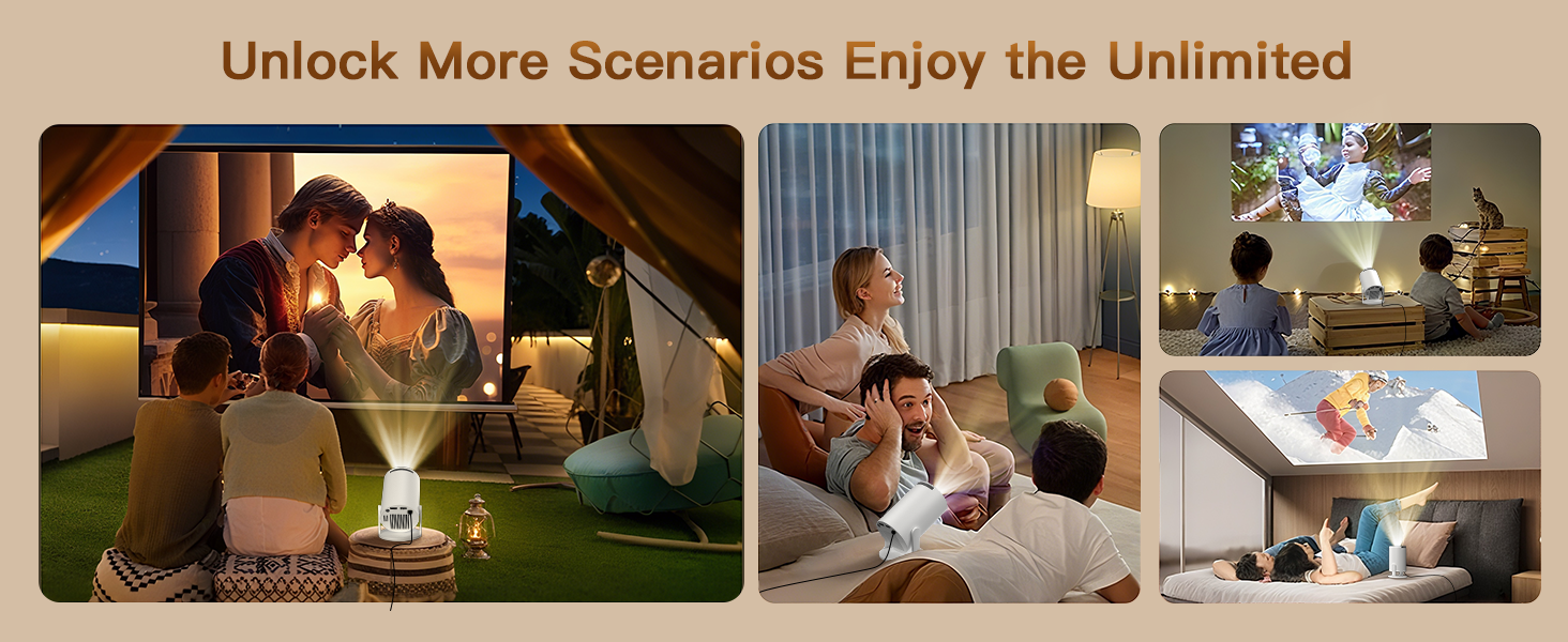 [5W Speaker&180°Rotatable Stand] Take your viewing experience to the next level with flexible 360° projection—effortlessly switch between ceiling mount , rear projection , or front projection . The 180° rotation allows perfect screen alignment from any angle. Plus, enjoy rich, powerful audio with the upgraded 5W speaker, delivering crisp sound to match stunning visuals