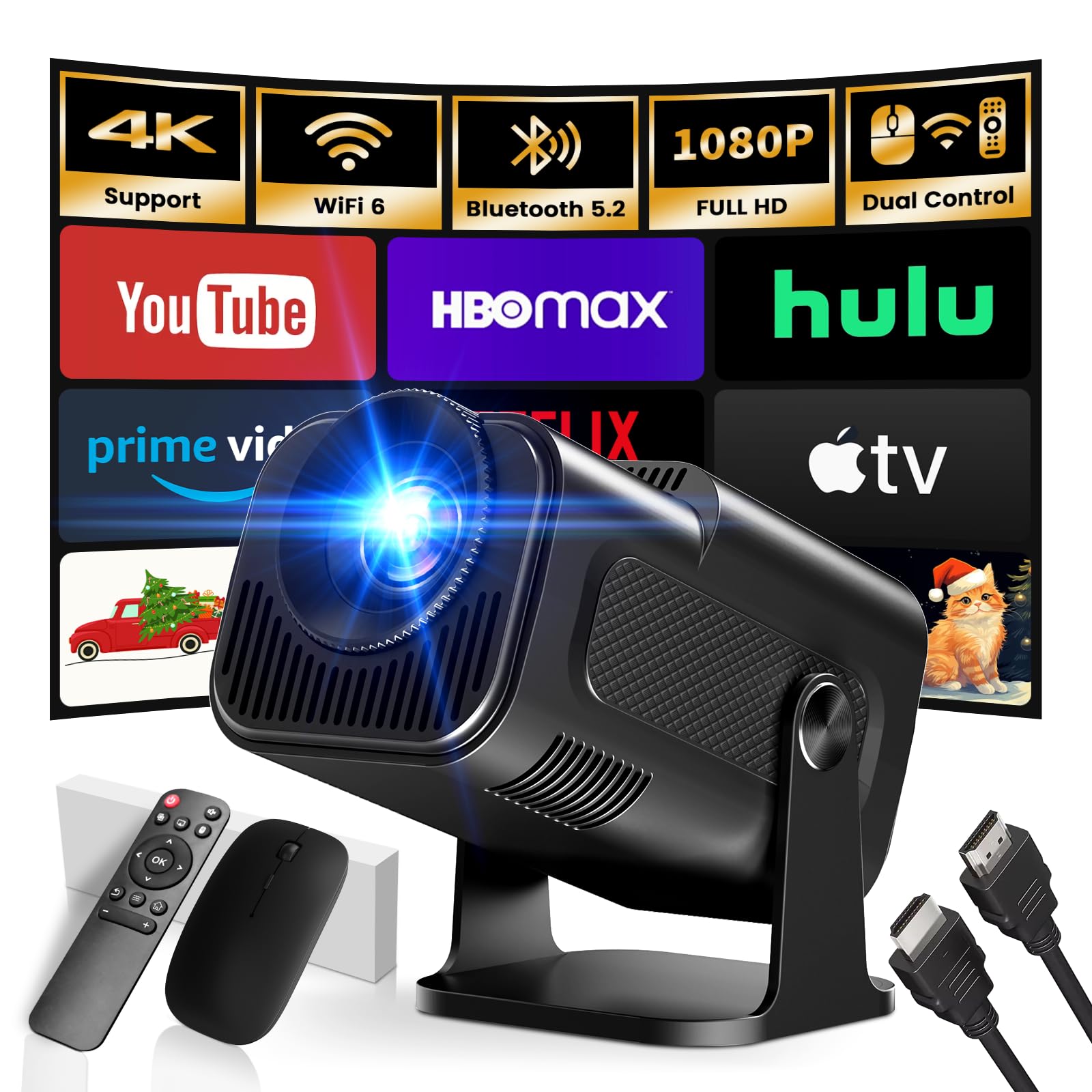 [Dual Control Mode & Built-in Android Smart OS]The Gaimoo GM300 smart projector supports dual control mode, allowing you to operate it with either the included mouse or the remote—whichever is more convenient for you. Built-in Android Smart OS, it gives you instant access to a vast library of streaming content from apps like YouTube, D+, Video, all without the need for an external TV stick.