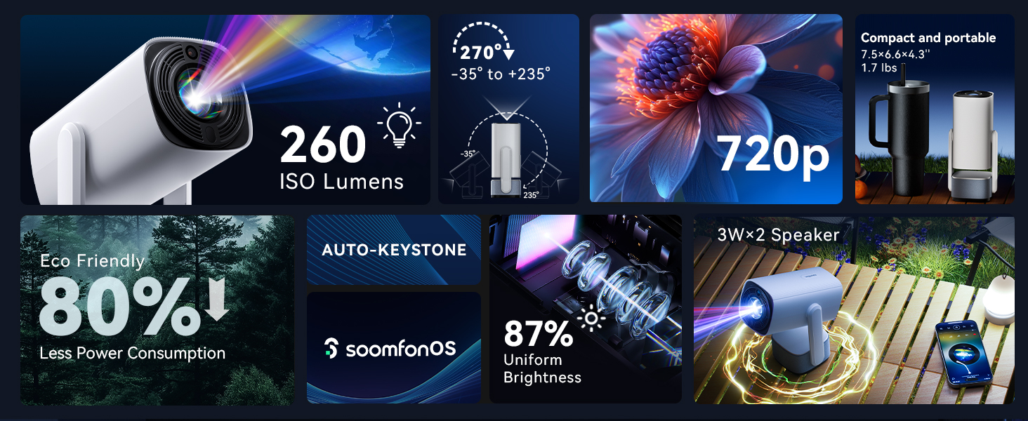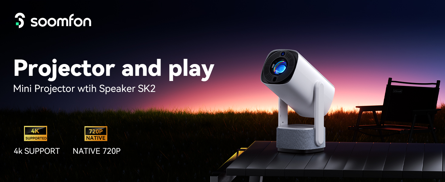 - [Auto Keystone and Electric Focus] The auto keystone can only automatically correct tilted images vertically. The electric focus allows easy screen adjustment to ensure the clearest picture. It is equipped with a 270° rotatable base, enabling you to effortlessly project images from the wall onto the ceiling. Its compact and portable design eliminates the need for ceiling-mounted installation, allowing you to create a mobile home theater anytime, anywhere. The SK2 bedroom projector comes with a tripod socket, facilitating tripod mounting or wall mounting via a 1/4-inch male-to-male interface.