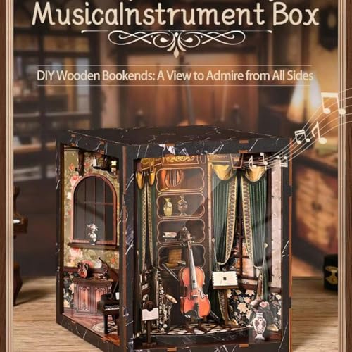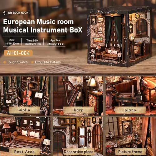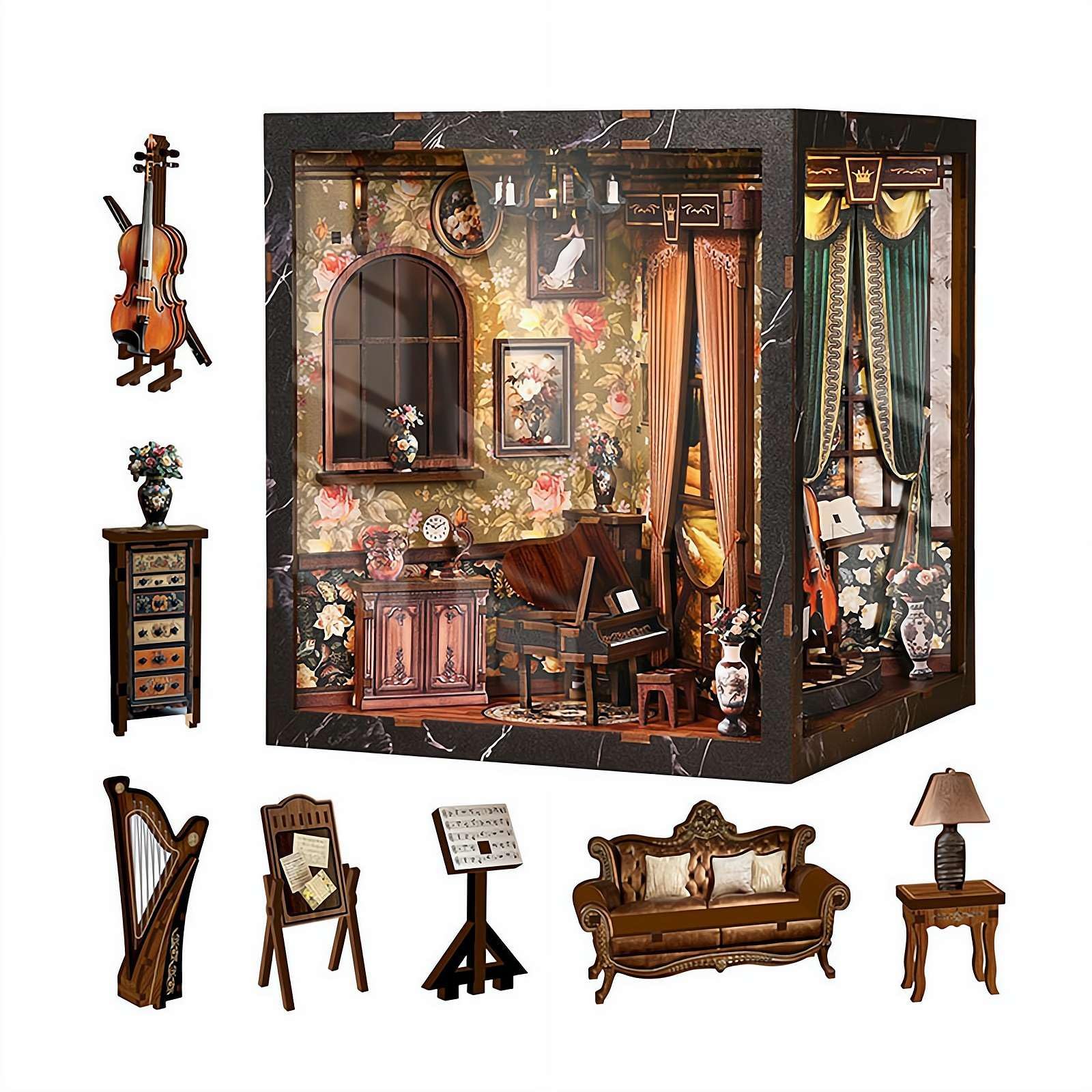 Miniature Music Room house Kit, Vintage-Style DIY Wooden Model with Piano, Harp, Violin & Elegant Furniture for Adult Crafting and Display