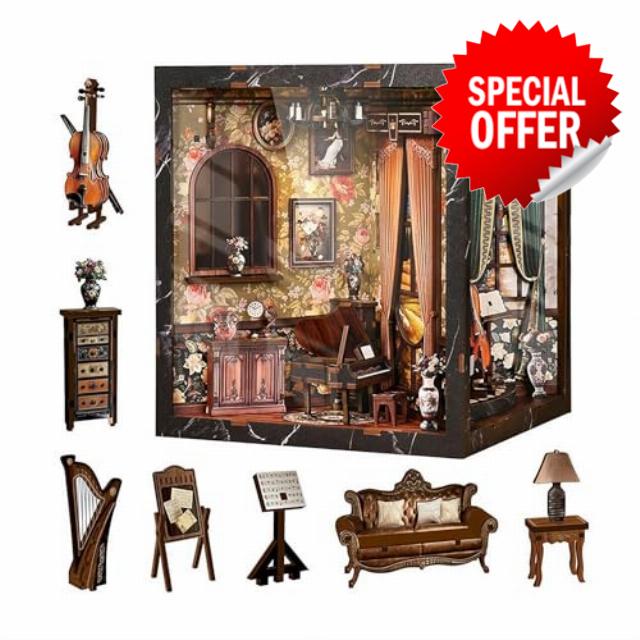 Miniature Music Room house Kit, Vintage-Style DIY Wooden Model with Piano, Harp, Violin & Elegant Furniture for Adult Crafting and Display