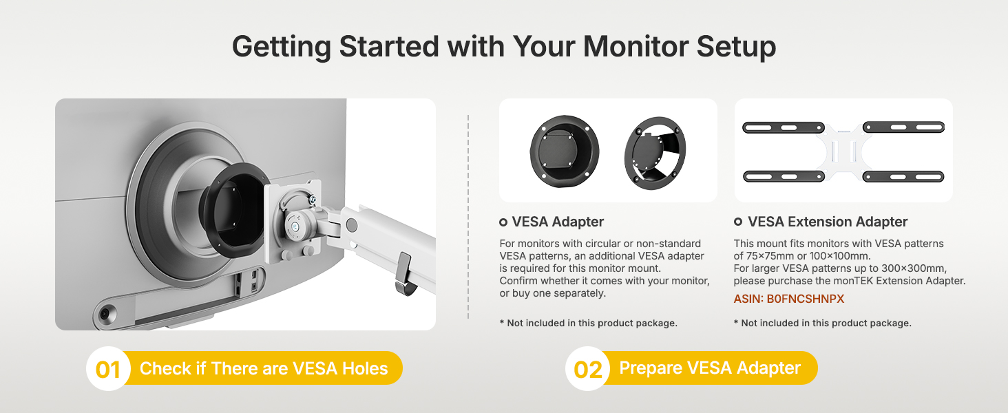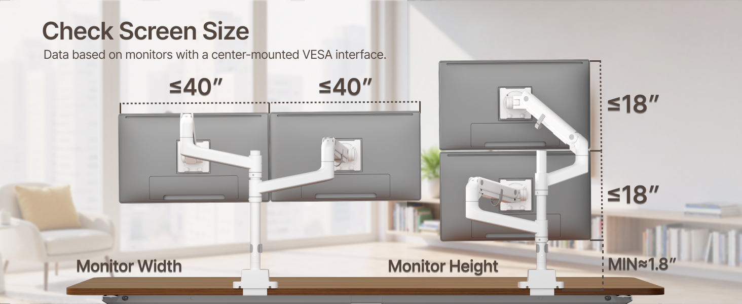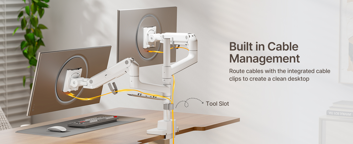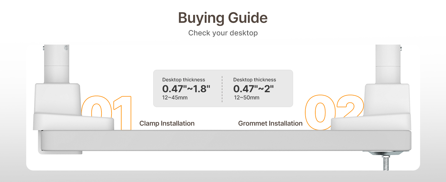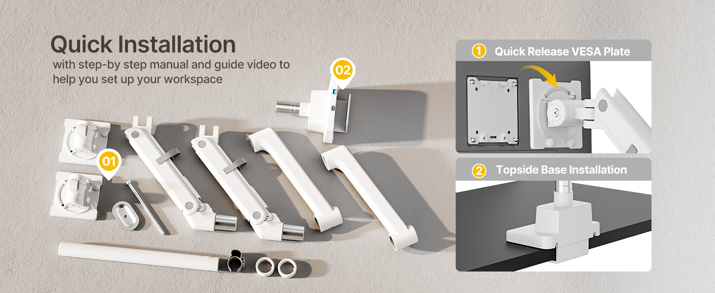 【Quick Installation】Choose between C-clamp or grommet mounting to suit your desk setup. The quick-release VESA plate allows fast and simple installation, while clearly labelled components ensure a smooth assembly process—saving you up to 30% installation time
