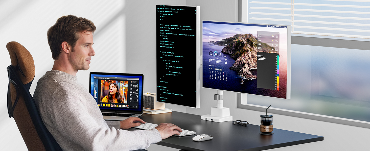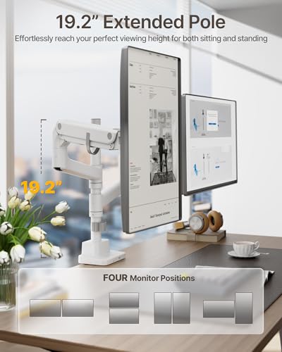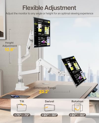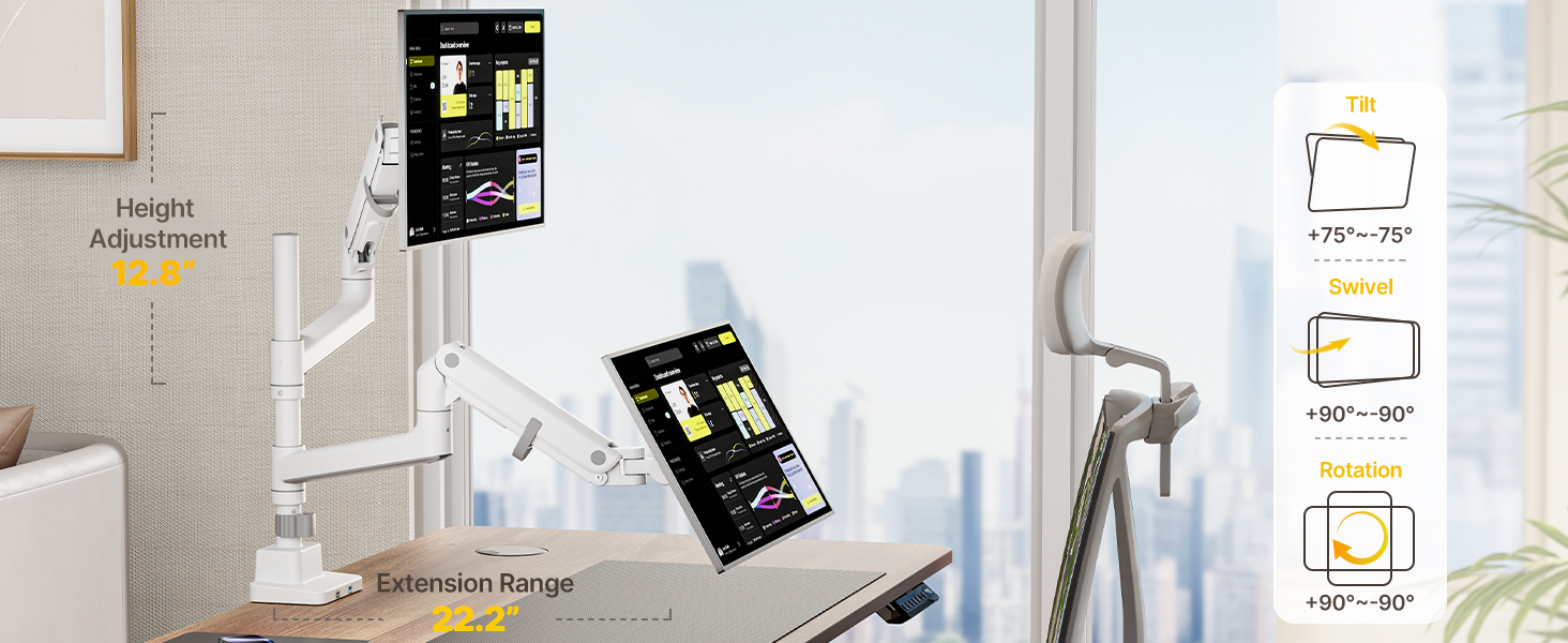 【Ergonomic Flexibility】Enjoy effortless adjustment with a tilt range of –75° to +75°, ±90° swivel, and ±90° rotation for landscape or portrait use. The 488mm height pole enables side-by-side or vertical double-monitor configurations. The arm offers a height range of up to 747mm and extends out to 564mm, helping you achieve the ideal viewing position and reduce neck strain