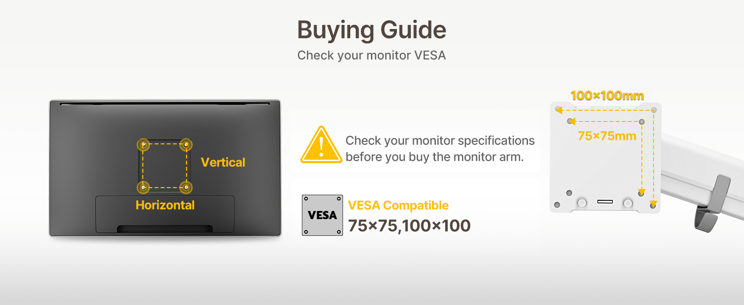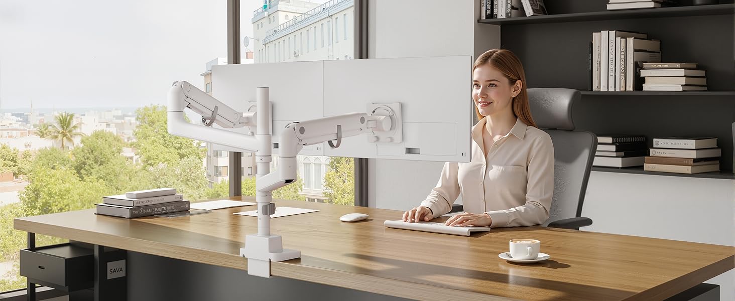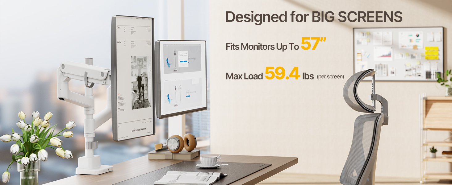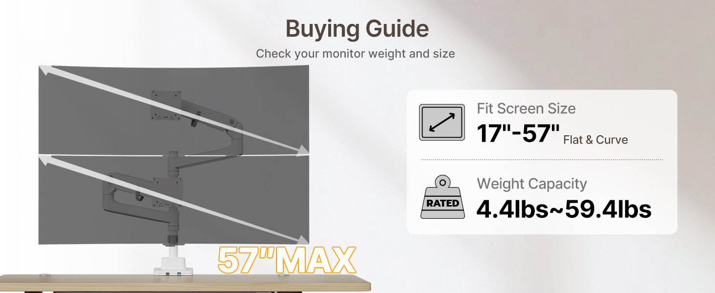 【Universal Compatibility】Designed for exceptional versatility, this dual monitor arm supports 17"–57" curved screens with VESA patterns from 75×75 mm to 100×100 mm. Compatible with major brands such as Samsung and LG, its heavy-duty aluminium construction provides reliable stability and supports up to 27 kg