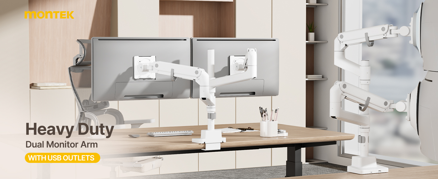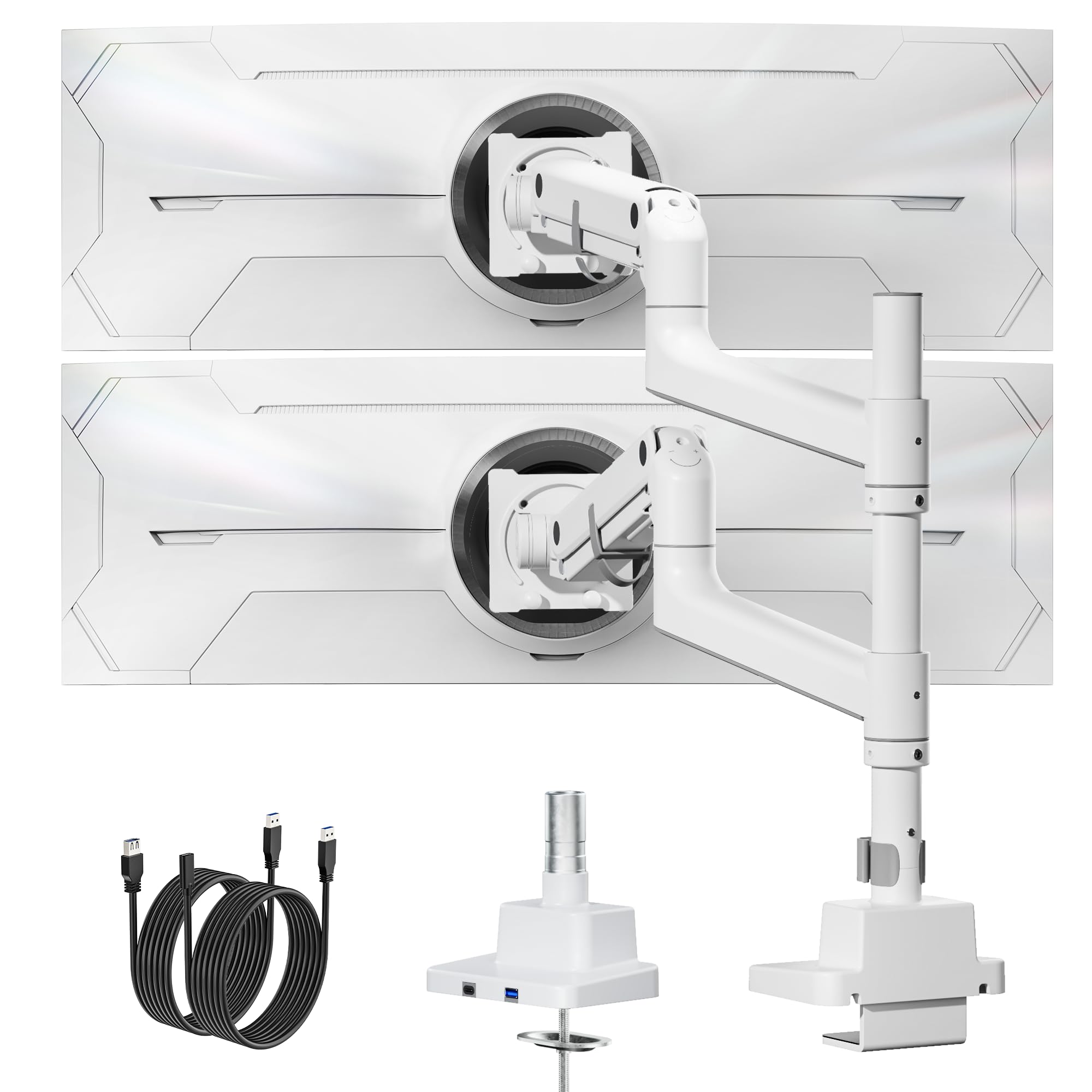 monTEK Dual Monitor Arm for 17-57” Ultrawide Screens, Holds up to 27 kg, Adjustable Gas Spring Arm with USB A/C, Heavy-Duty Vertical Stackable Monitor Stand, 75/100mm VESA Mount, White