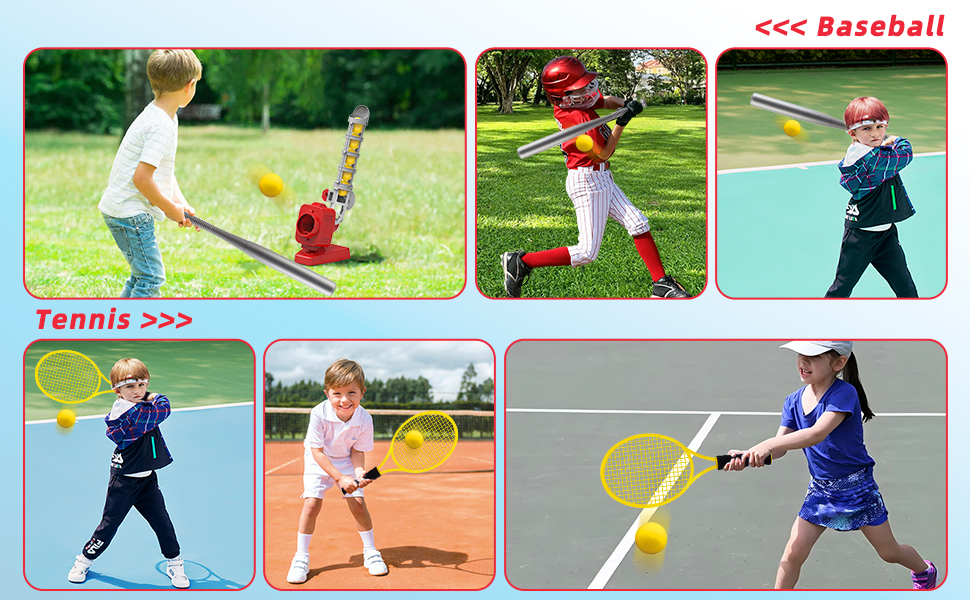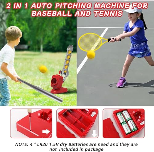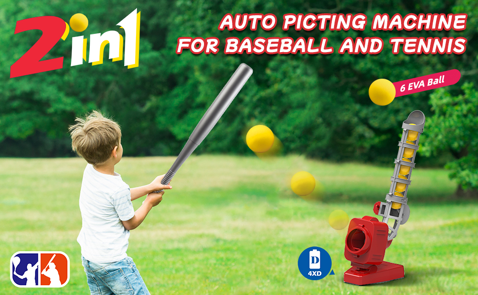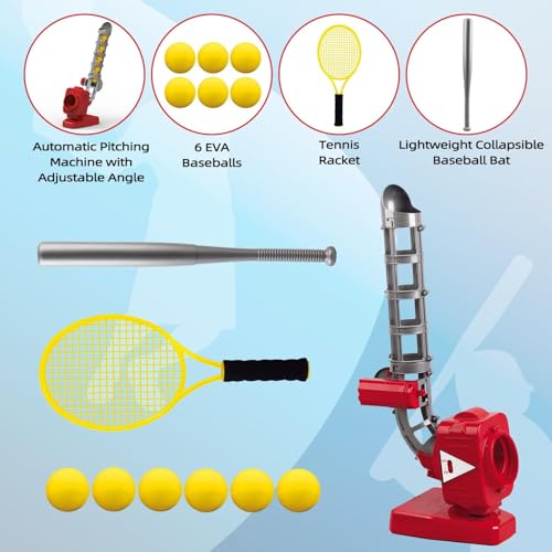 2 in 1 Pitching Machine:This 2 in 1 baseball and tennis pitching machine set includes a ball pitcher, 6 EVA baseballs, a lightweight collapsible bat and a tennis racket. Just enjoy the baseball and tennis with this pitching machine with your kids