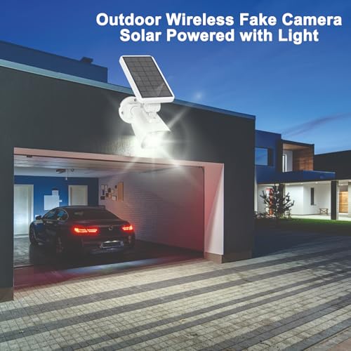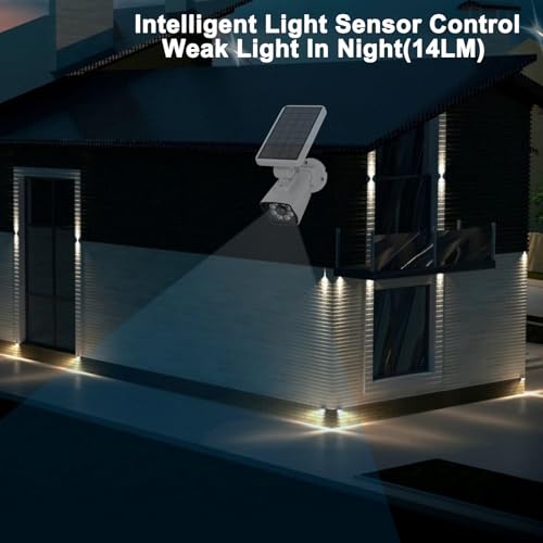 - 2 in 1 Solar Fake Security Camera with Lights: Our motion sensor solar security lights combine a high-power floodlight with a realistic-looking fake camera. The 2 in 1 design not only provides you with the brightest floodlight to illuminate your garden, garage, pathway, yard, patio, or deck at night but also deters potential intruders with the appearance of a surveillance camera. With this product, you get enhanced security and illumination all in one.
