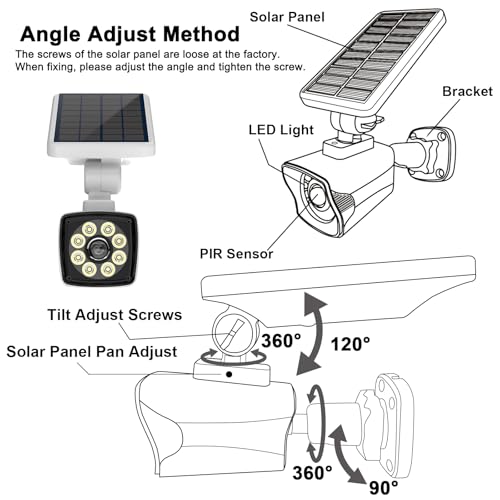 - Easy Installation Adjustable IP65 Waterproof Camera: Since they are wireless and solar powered, there's no need to worry about complex wiring, The lights come with all the necessary mounting hardware, and you can easily attach them to walls, fences, or other outdoor structures using the provided screws. The adjustable design of the light head and solar panel allows you to optimize the lighting and solar charging angles according to your specific needs.