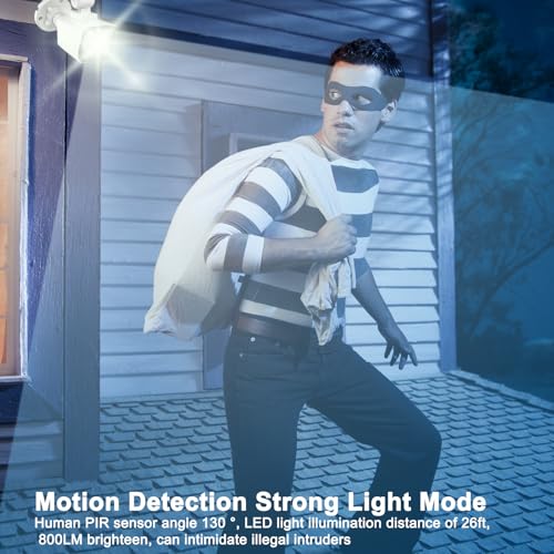 - PIR Motion Sensor Wired Free Decoy Security Camera: The decoy security camera built in PIR motion sensor is highly sensitive, with a detection range of 26 feet and a wide detection angle of up to 130 degrees. The camera work on motion activated mode, when motion is detected in the dark, the floodlight instantly switches to bright light, and after the person leaves, it automatically turns off after 10 – 60 seconds;