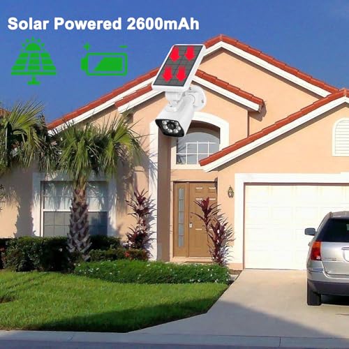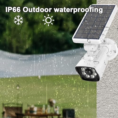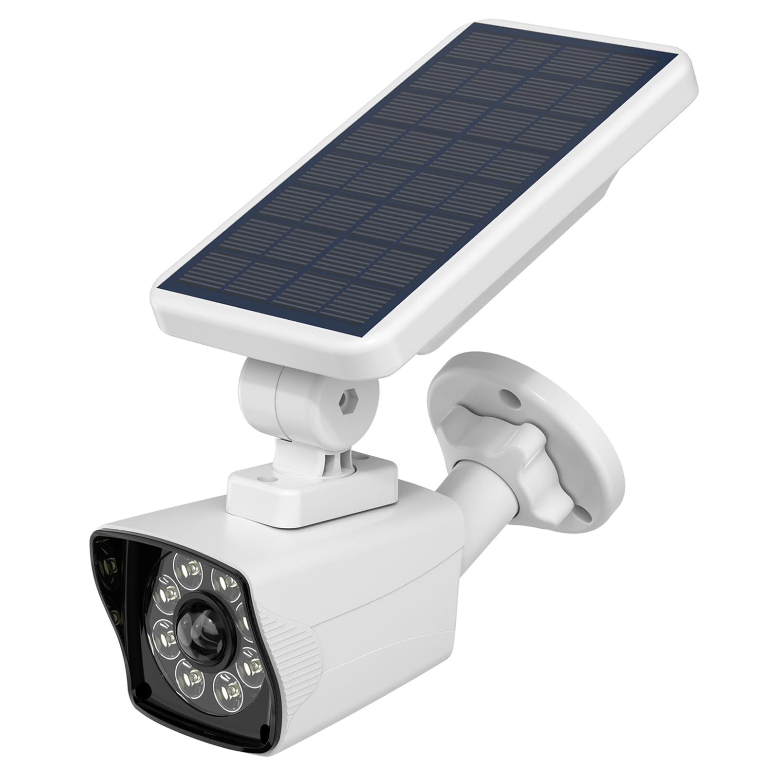 - Dummy Cameras Spotlight with 2600mAh Battery: This dummy camera equipped with solar panels, it converts light energy into electrical energy under sunlight during the day and stores it in the built-in 2600mAh rechargeable battery, which provide up to 8 – 12 hours of continuous lighting. It does not require an external power source, avoiding wiring problems and lighting interruptions caused by power outages.