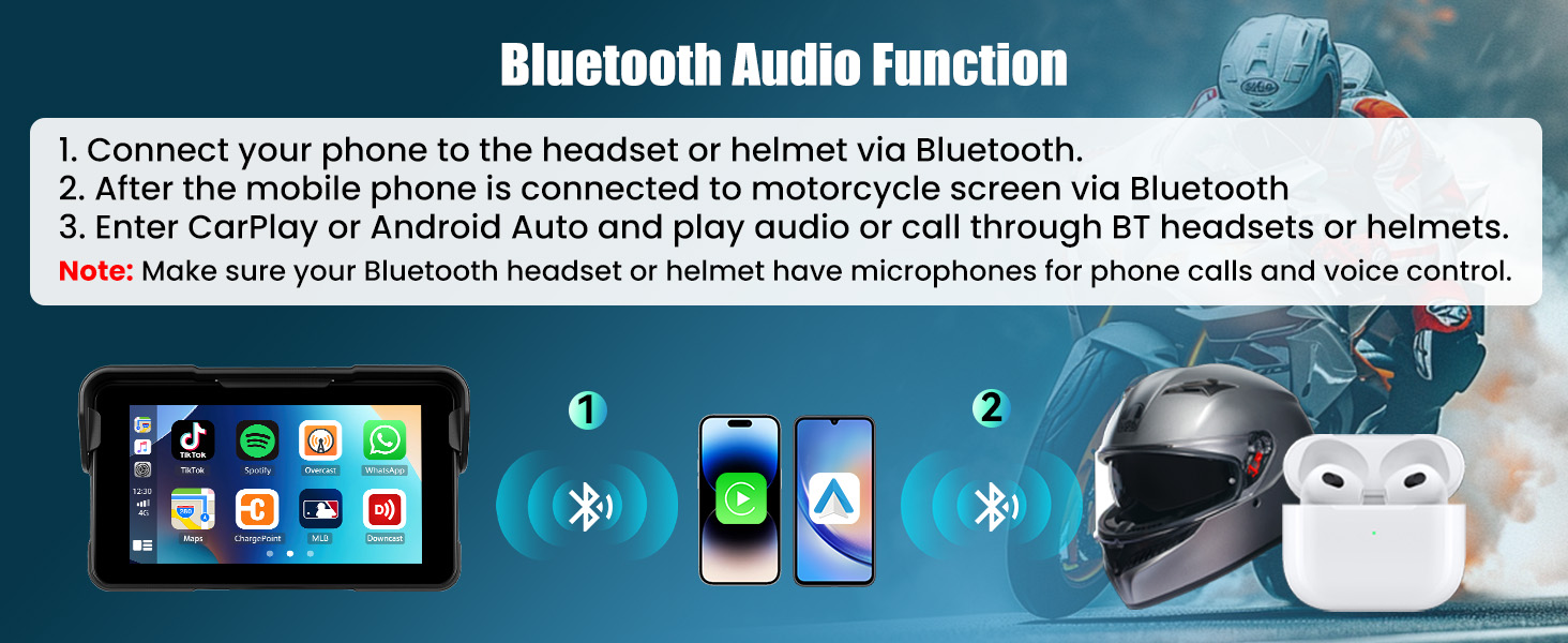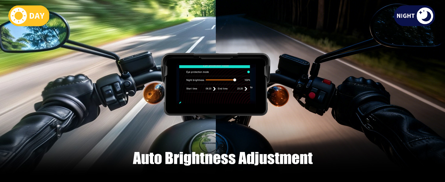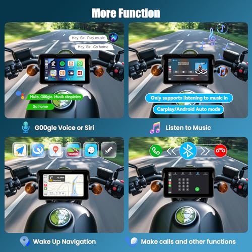 【Support Bluetooth Connectivity】The carplay screen for motorcycle can connect to a mobile phone and enter carplay or Android Auto function, then you can connect the mobile phone to a Bluetooth headset or helmet to listen to music, and make hands-free calling. Through the wireless Bluetooth function, Whether you're navigating, taking calls, or streaming music, the motorcycle gps navigation system ensures a seamless and hands-free experience. Stay connected and focused on the road