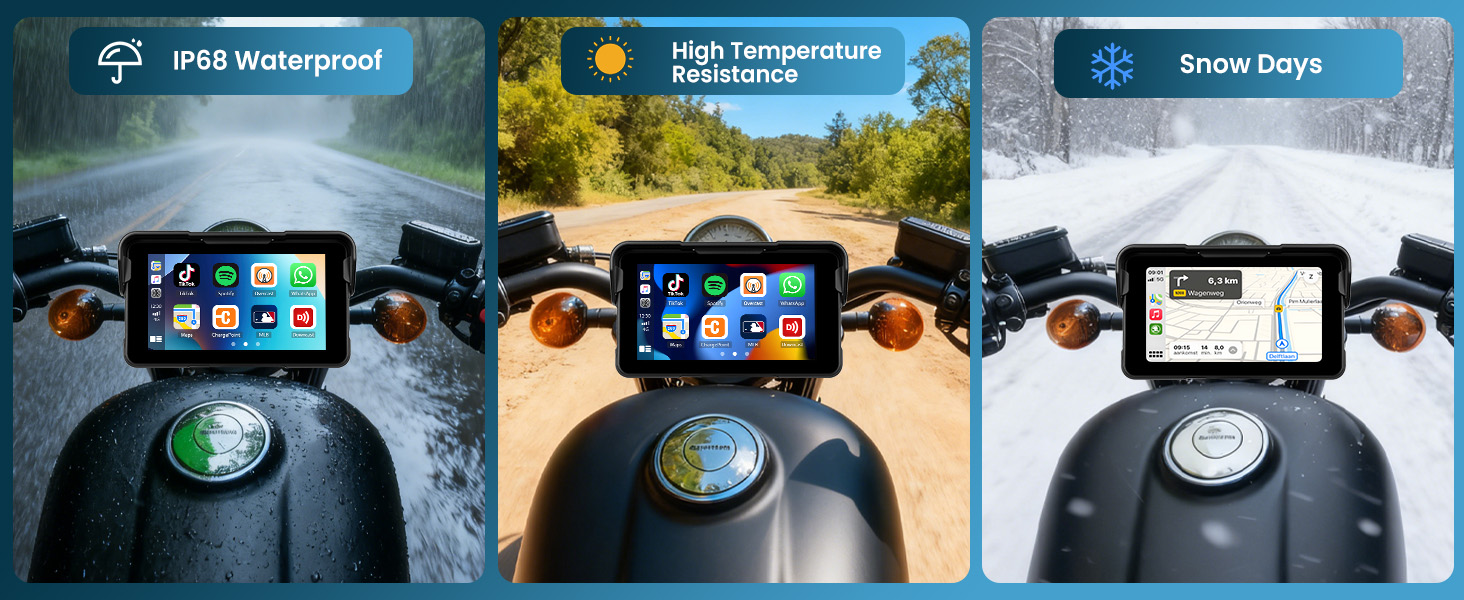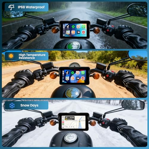 【5 Inch HD Touch Screen & IP68 Waterproof】The wireless android auto motorcycle screen with 5 inch HD touch screen, making the visual effect more intuitive and the touch responsive, and the motorbike screen features IP68 waterproof can provide a clear and wonderful viewing experience even under bright outdoor sunlight or rainy day