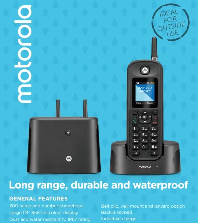 Keeping you going whatever the weather is doing. The Motorola Ruggedised O20x is a powerful long range digital cordless telephone, offering a durable, waterproof solution to outdoor telephony. The rugged design, combined with a reassuring waterproof cabinet, certified to the international standard IP67, means you can make calls indoors or out, confident of a reliable performance, in all conditions.