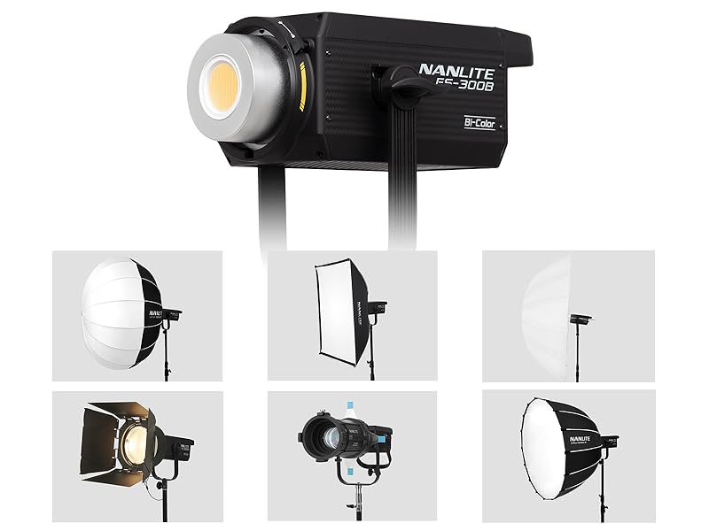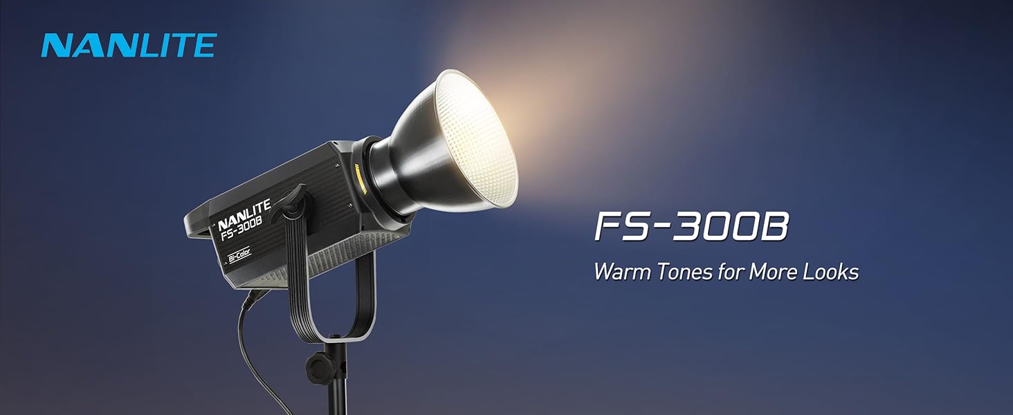 The video showcases the product in use.The video guides you through product setup.The video compares multiple products.The video shows the product being unpacked.NANLITE FS-300B 300W Bi-Color LED Spotlight