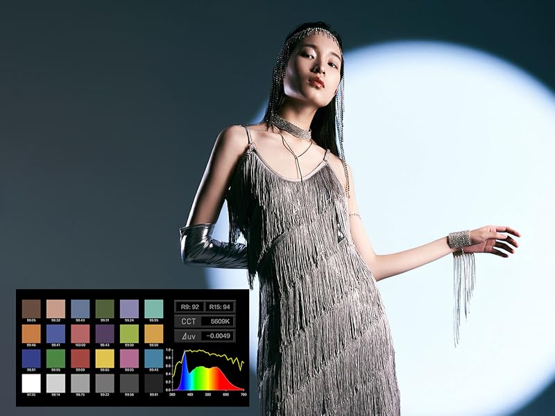 - Professional Bi-Color LED Spotlight with Studio-Grade Brightness: 38720 lux @1m output (5600K) for cinematic lighting, covering 2700K-6500K bi-color tuning. Includes Bowens mount reflector for precise beam control.