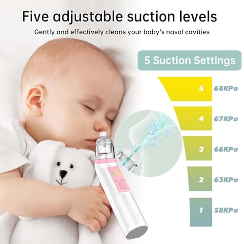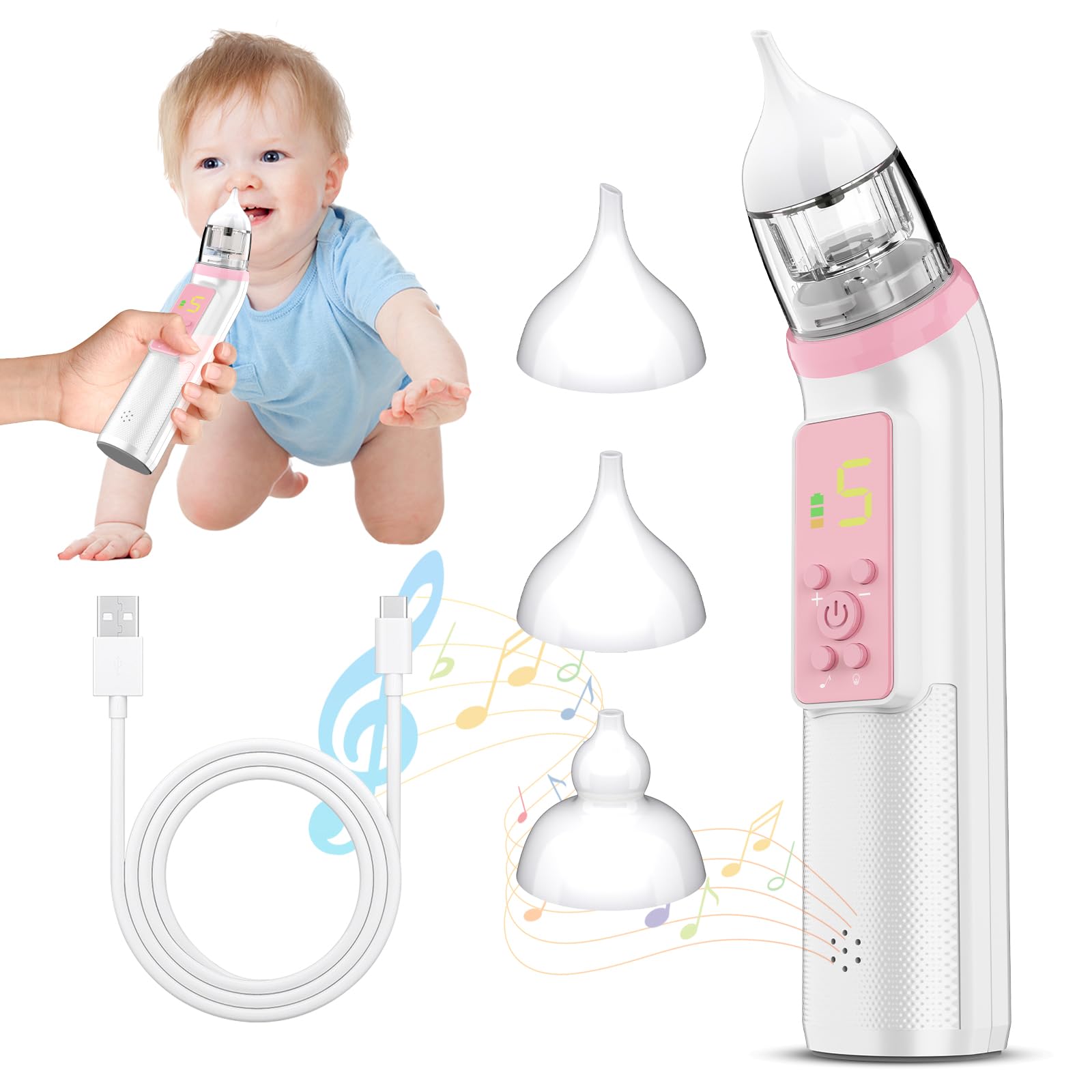 Nasal Aspirator Baby Electric, 5-Level Suction Adjustment Nose Suckers, IP65 Waterproof Electric Nose Cleaner Portable Easy-to-Clean & 3 nozzles with Soothing Music