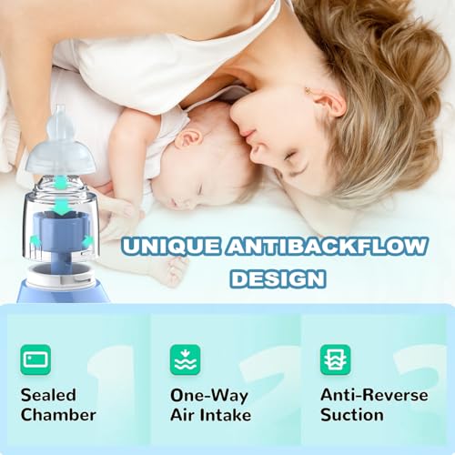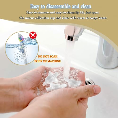 - Anti-backflow Design: The electric nasal aspirator adopts a one-way air intake anti-backflow design, which helps to accurately suck nasal secretions into the collection cup. The nozzle kit is detachable for easy cleaning. After use, just wash the components with warm water or soapy water. (Note: The host cannot be immersed in water)