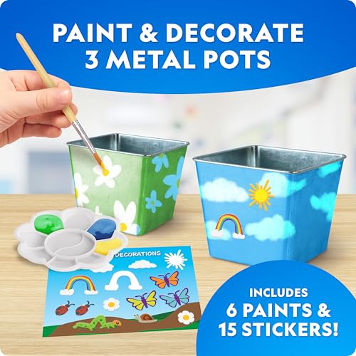PAINTABLE POTS KIDS CAN DECORATE – This super-fun kids garden kit includes three durable, stainless steel pots that are perfect for decorating! Kids can use the 15 stickers and 6 paints included with the kit to make their garden beautiful!