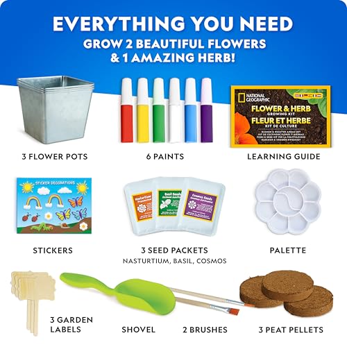 NATIONAL GEOGRAPHIC Flower & Herb Gardening Kit for Kids – Gardening Set with 3 Stainless Steel Pots, Paint & Stickers, Kids Plant Growing Ki