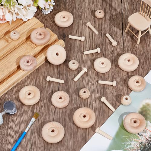NBEADS 60 Sets Wooden Wheels Set for Crafts, 3 Sizes Unfinshed Wooden Wheel Building Blocks Set Mini Wheels with Axle Pegs for Crafts Painting Colors Wood Working Pegboards