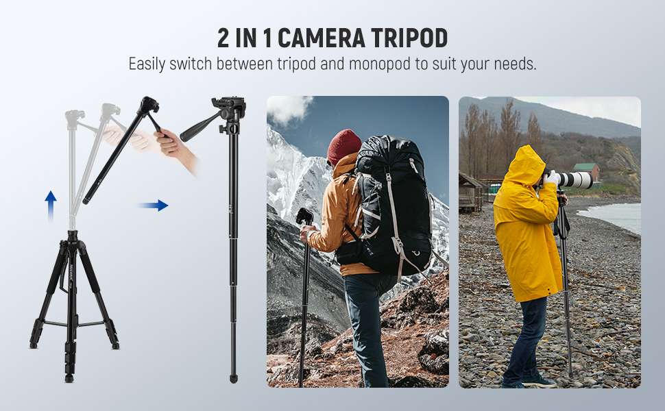 【Drag Pan Head & Handle】 With the 3 way drag pan tilt head, you can seamlessly transition from horizontal to vertical compositions. The drag handle and bubble level ensure quick and precise adjustments, while the 720° rotatable nonslip rubber feet provide stability on any terrain. Ideal camera tripod equipment as professional photography gear for vlogging, live streaming, video recording, filmmaking