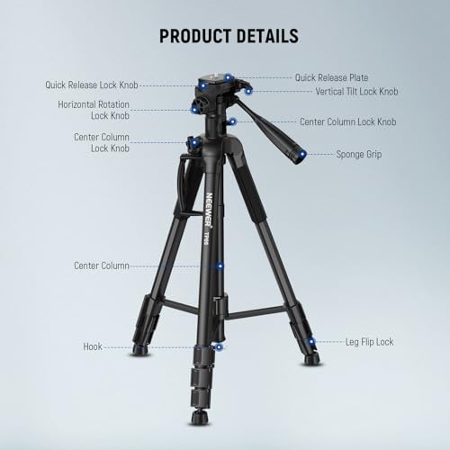 NEEWER Basics TP05 74″ Video Tripod Monopod, 3 Way Pan Tilt Head Holder Compatible with DSLR, Travel Recording Stand, Overhead Camera Mount, Crossbar, 17.6lb Load