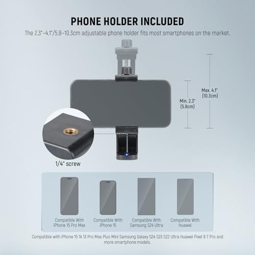 【Universal Phone Tripod Mount】 A 2.3"-4.1"/5.8-10.3cm adjustable phone holder attachment is compatible with iPhone 16 15 14 i Phone 13 Pro Max Plus Samsung Galaxy S25 S24 Ultra and other android smartphones as content creator essential camera photography videography accessories and influencer must have filming creation