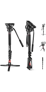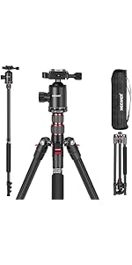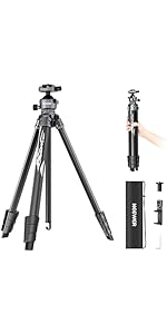 【Sturdy & Portable Tripod】 Made of aluminum alloy, this heavy duty video camera tripod stand securely mounts digital cameras (compatible with Canon Sony Nikon DSLR), camcorders, action cameras, projectors, binoculars, spotting scopes, telescopes, and cellphones up to 17.6lb/8kg. At just 3.9lb/1.75kg, it folds down to a compact size of 11.4"x2.95"x2.2" (290x75x55mm), with a built in handle and carrying bag lightweight for outdoor photography