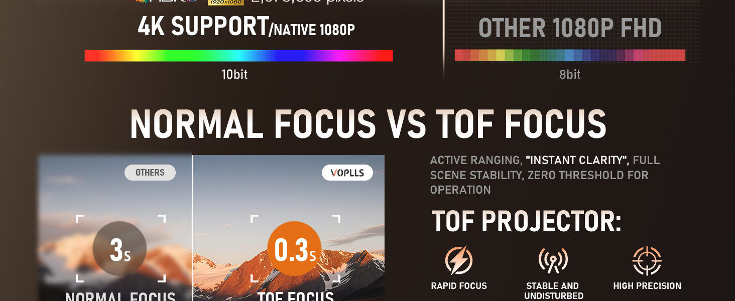 - [AI-Powered Ultra-Fast TOF Autofocus] Powered by advanced TOF laser technology, The VOPLLS K3 smart projector achieves razor-sharp focus in just 0.3 seconds – eliminating the frustrating 10-second wait common with traditional models. With fully automatic keystone correction that instantly adapts to any placement angle, you're guaranteed a perfectly rectangular image without manual adjustments. Your ideal movie night is now truly hassle-free