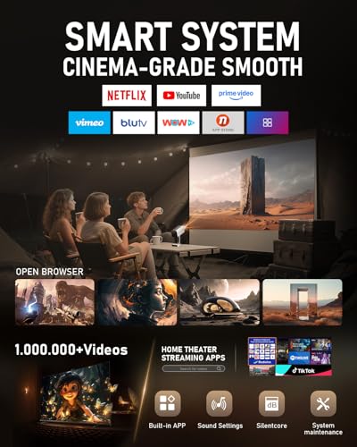 - [Lightweight Linux System] Instant-On Simplicity: Say goodbye to loading screens. A single press instantly launches your content.Zero Bloatware, Zero Ads: Forget the cluttered, ad-ridden interfaces of Android movie projectors. Enjoy a clean, distraction-free viewing environment. Engineered to Never Slow: Our efficient Linux architecture is specifically designed to eliminate lag and maintain day-one speed, delivering lasting performance that Android can't match