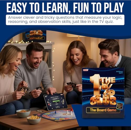Bring the excitement of the hit TV game show into your living room with The 1% Club Board Game. Designed for 3-6 players aged 8 and above, this entertaining board game challenges you to answer clever and tricky questions that test your logic, reasoning, and observation skills. The game is easy to learn yet fun to play, making it perfect for family game nights, gatherings with friends, or anyone who enjoys a mental challenge. The beautifully designed game includes question cards, a game board with money value spaces, player pieces, a timer, score sheets, and a card holder that adds to the authentic game show atmosphere. As you progress through the game, questions become increasingly difficult, just like the television show, with only the sharpest minds making it to the exclusive 1% Club. This board game develops fine motor skills through handling cards and moving pieces whilst providing hours of entertainment. Whether you’re a fan of the TV show or simply love quiz games that make you think differently, The 1% Club Board Game delivers an engaging experience that will have everyone laughing, debating, and celebrating their way to victory.