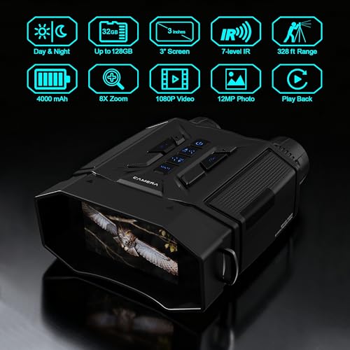 Night Vision Goggles with FHD Video & 12MP Photo, 8X Digital Zoom, Night Vision Binoculars with 7-Level IR, 4000mAh Battery, Gifts for Him, Men and Husband, Hunting Camping Wildlife
